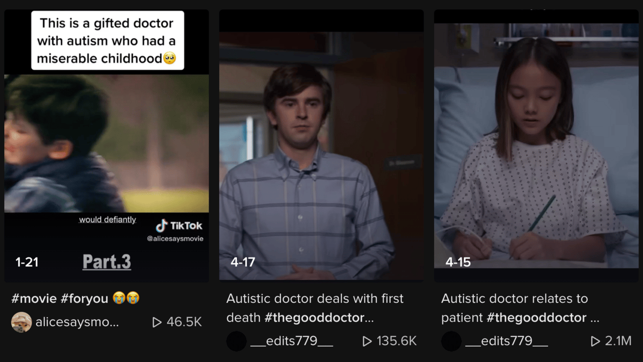 The Good Doctor is an especially popular show to cut up like this because many of the pages that show the videos frame them with some combination of “genius doctor with autism saves patient” or “incredible autistic surgeon tells woman to shut up” or whatever. Interestingly enough, while doing research for this piece, I discovered a bunch of pages that are doing the same content strategy, but with the Korean version of The Good Doctor. So it makes sense that as TikTok has become the dominant video platform, Good Doctor clips are going viral there too now. And accounts are doing the same growth hack there, as well.
