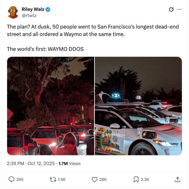 This is one of those I hadn’t even really considered tbh. According to the X user that posted this, no one actually got in the cars. They all showed up, waited 10 minutes, and charged everyone a $5 no-show fee and left. Waymo then disabled pickups in the area until the next morning.