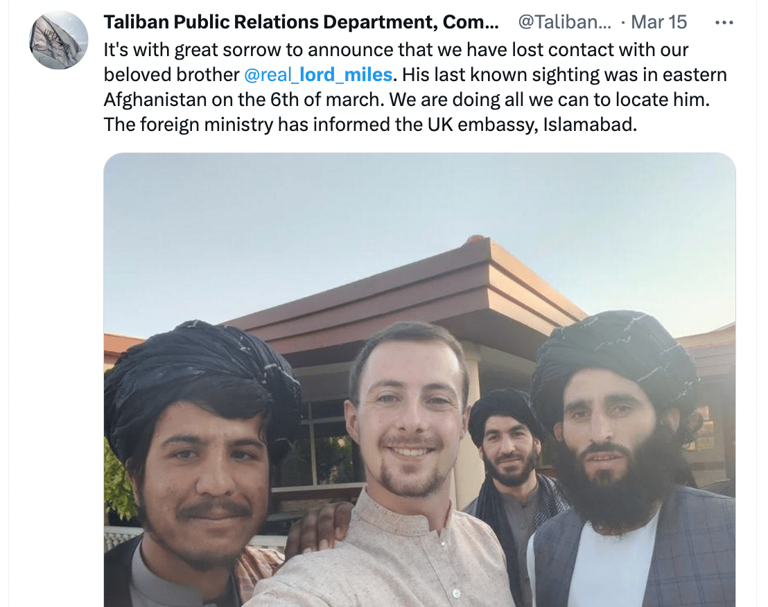 An English-language Twitter account claiming to be associated with Taliban’s PR department announced recently that a British travel YouTuber Lord Miles, real name Miles Routledge, appears to have gone missing while visiting Afghanistan.