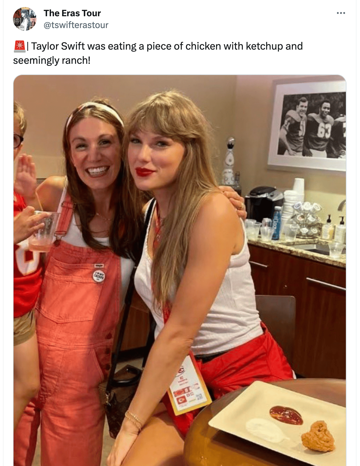 If you’re seeing references to “seemingly ranch,” this tweet is why. The image isn’t high-res enough to see if there is seasoning in there, so I can’t be certain that’s ranch. If you told me Taylor Swift was eating a single piece of fried chicken with ketchup and mayo I’d believe that too.
