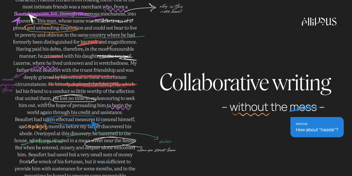 Ellipsus is a new writing tool for people who write together. Think Google Docs meets GitHub: Invite others to edit, share feedback, or submit their own drafts, without losing control over which changes make the final draft.