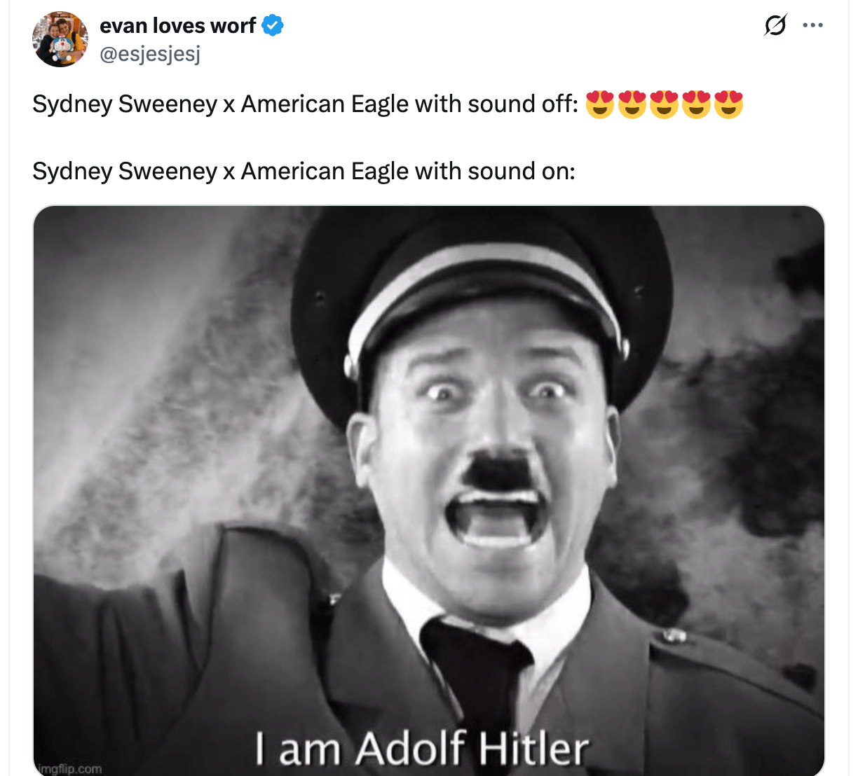 But it’s @sweeneydailyx’s second post on the 24th that really kicks things into overdrive. Though it took about a day for it circulate through users’ algorithmic feeds. The second video, which @sweeneydailyx captioned, “Sydney Sweeney x American Eagle, oh my god,” got a lot of attention from liberal and leftist accounts. Probably because it leans even further into the “great genes” joke. Popular liberal account @esjesjesj made a joke about it, writing, “Sydney Sweeney x American Eagle with sound off: 😍😍😍😍😍 Sydney Sweeney x American Eagle with sound on:” above a picture of Hitler from Epic Rap Battles Of History.