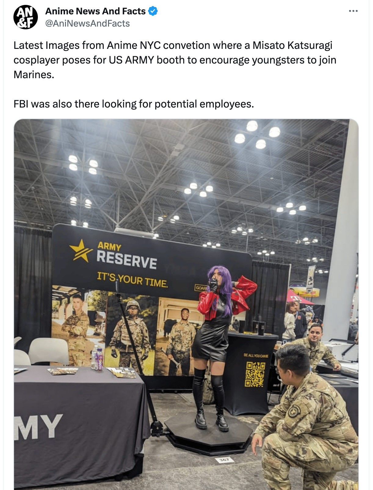 Yes, the Army absolutely had a booth at the Anime NYC convention last weekend, along with the Marines and the FBI, but they never mentioned hiring any cosplayers. According to a comment on Reddit, the Misato cosplayer was just taking advantage of a photo stand they had. I found multiple other videos and pictures from the convention that support this.