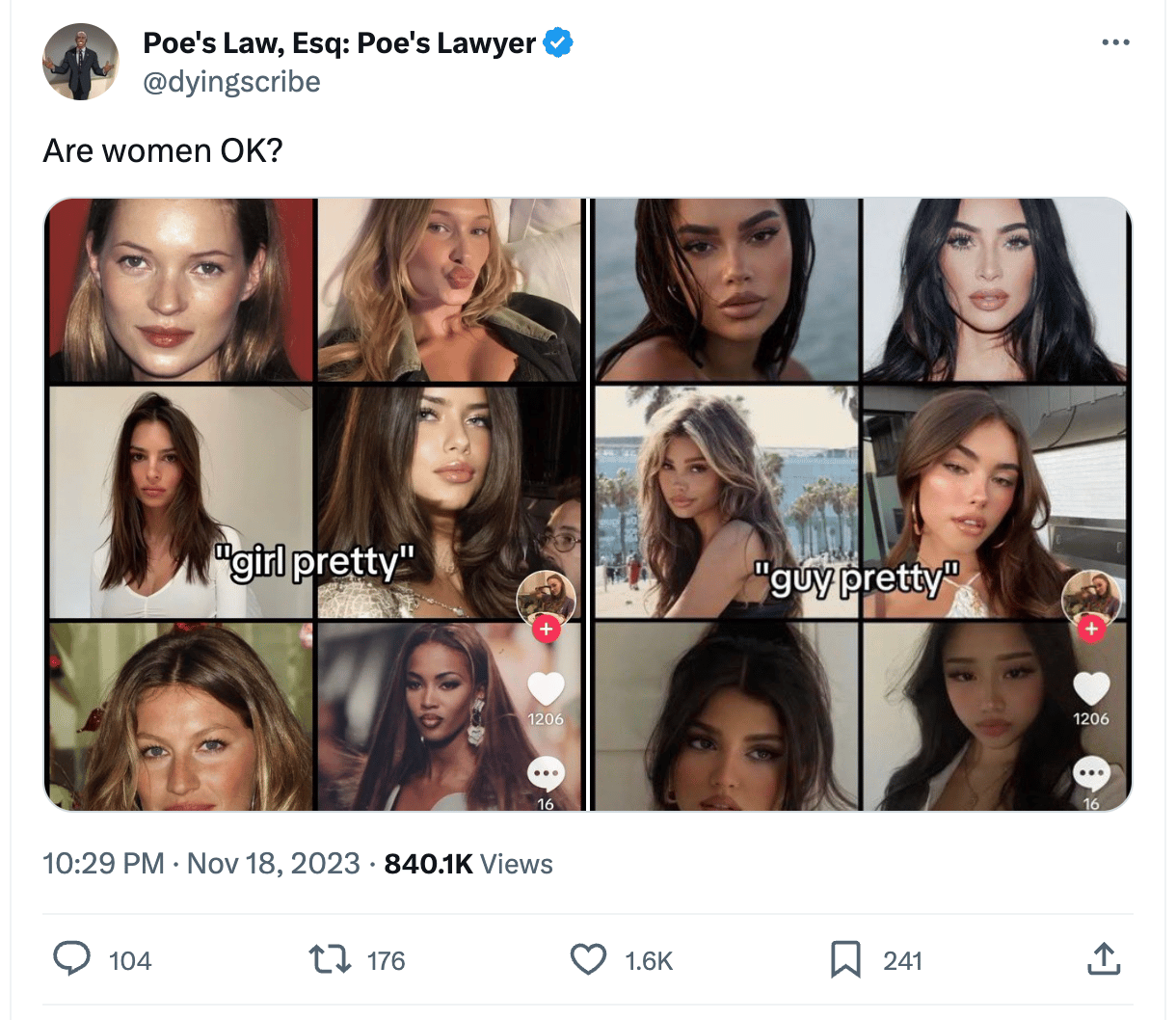 The number one content trend of 2023, as far as I’m concerned, is TikTok rage bait. It has recently ballooned into a national moral panic and it’s basically the last thing happening on X that seems to have any real cultural relevancy. I came across this post from a right-wing account about a supposed TikTok trend identifying women that are “girl pretty,” or pretty to other women, versus women who are “guy pretty”. It’s allowed a bunch of conservatives to rant in all kinds of insane ways about the degeneracy of “Gen Z,” which is just shorthand for “young women,” the same way the word “woke” is just shorthand for “minorities”.