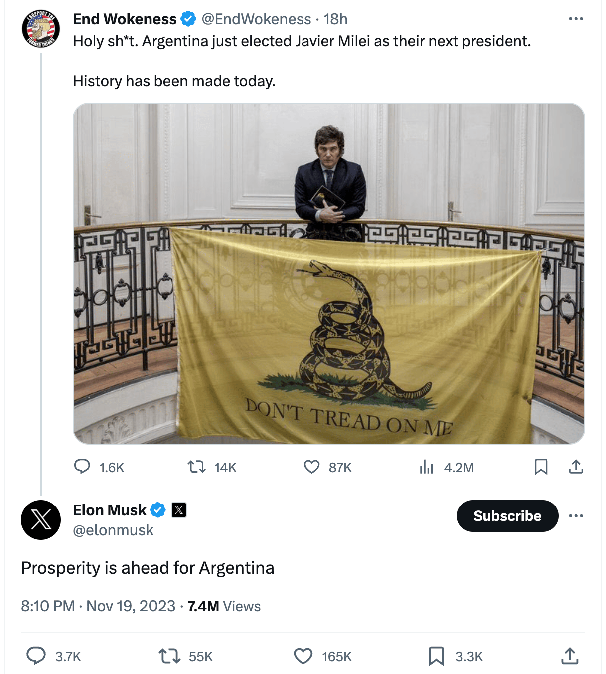 This seems like an unprecedented disaster for Argentina. But both Elon Musk and the X account @EndWokeness think this is a good thing, so who’s to say really.