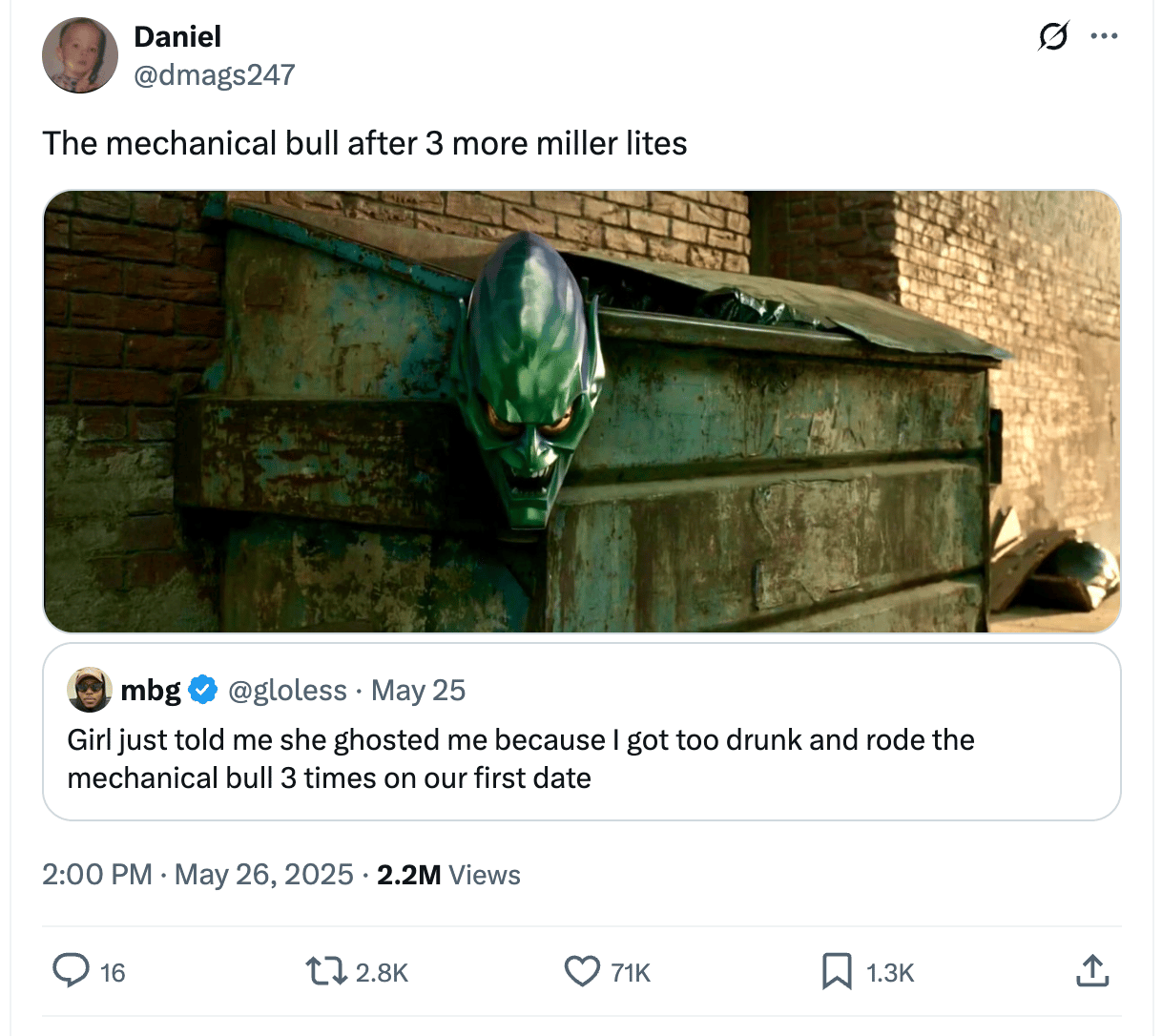 For the record, the original is from Monday, when an X user posted, “Girl just told me she ghosted me because I got too drunk and rode the mechanical bull three times on our first date.” The post is a perfect example of what goes viral on the homogenized timeline: A private bit of dating gossip presented for public judgement, inviting conversations about gender around a completely random social experience.