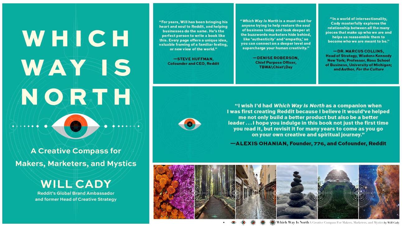 My book is called Which Way Is North: A Creative Compass for Makers, Marketers, and Mystics and it comes out via Penguin Random House on 10/10/23, World Mental Health Day. It asks: where does creativity come from? To answer, it explores through essay, memoir, meditations, and exercises the relationship between our anxiety and our creativity; ultimately suggesting that these come from the same place in our hearts. Yes...I said hearts and I mean that literally. Click here to learn more and order from your preferred retailer.
