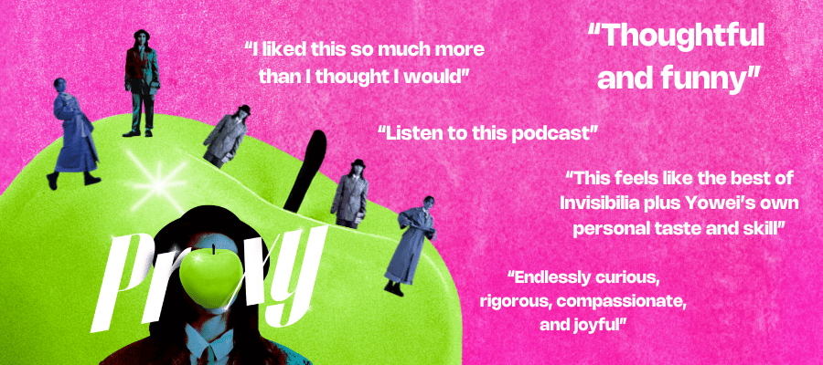It’s the knot you can’t untangle — a problem so unique, it makes you feel alone. But what if you could talk to someone who’d been through the exact same thing? On Proxy, a new indie podcast from the former host of Invisibilia, Yowei and her team find just the person you were looking for, the person who can help you get unstuck. It’s not therapy - it’s emotional investigative journalism™️.