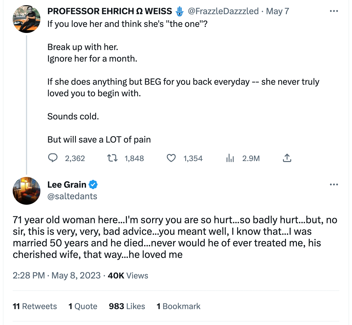 Anyways, rant over. The fact that Twitter is now full of very unwell pickup artists and older people paying for Twitter Blue led to this interaction, which does not technically qualify as a ratio, but definitely feels like a good example of just what Twitter is now. Though, before you start to sympathize with Lee down there, just to be totally clear, this woman’s account is horrendous. Like just the worst, most toxic, racist, transphobic Facebook-brained nightmare stuff you can imagine.