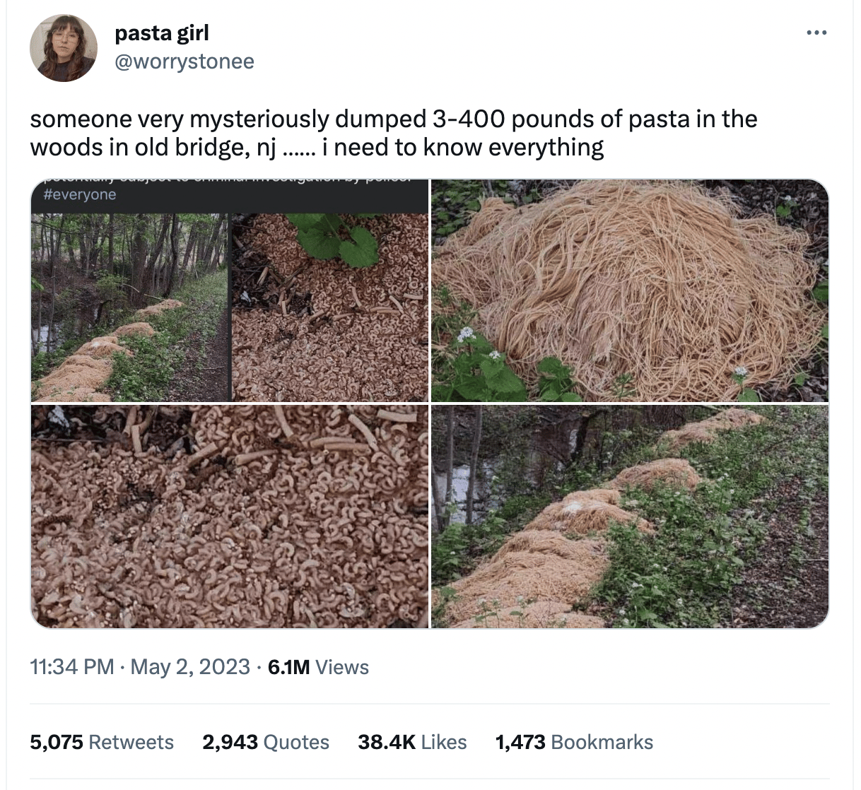 I assume that a few weeks ago you learned that someone was dumping hundreds of pounds of pasta in the woods outside Old Bridge, New Jersey. It immediately became one of those weird mysteries that makes the rounds, like an Italian-American variant of those killer clowns from a while back.