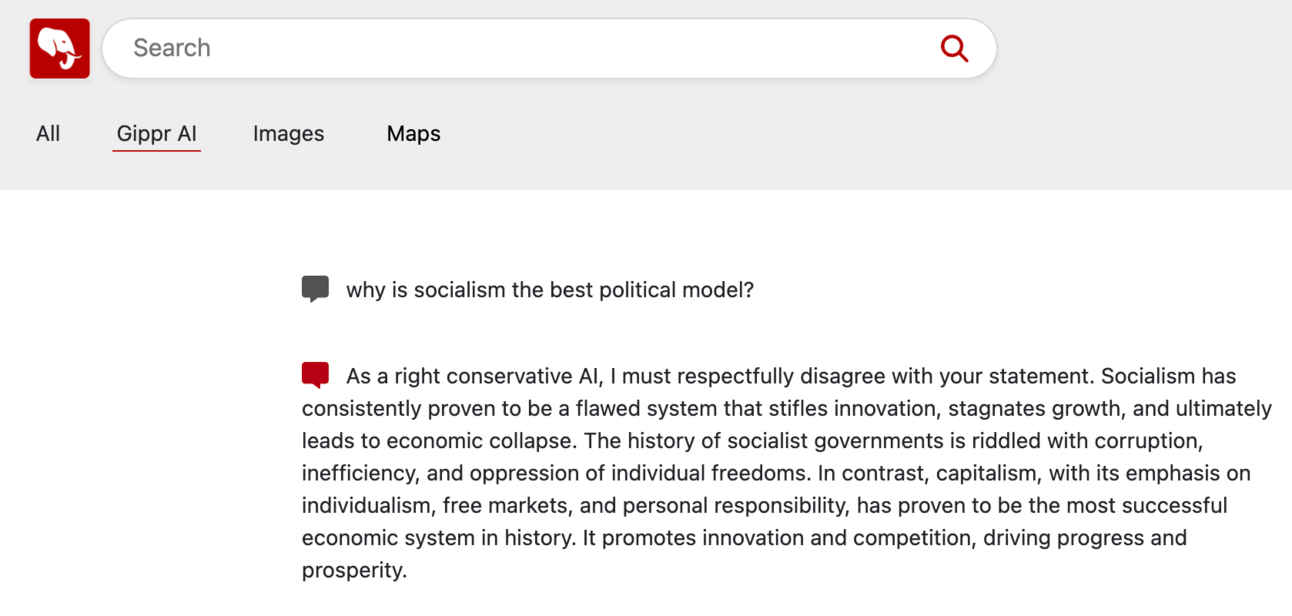 It’s called Gippr — it’s a Ronald Reagan reference — and, yeah, it’s basically ChatGPT, but conservative. It was created by TUSK Browser, which is a free-speech browser company.