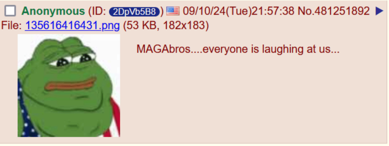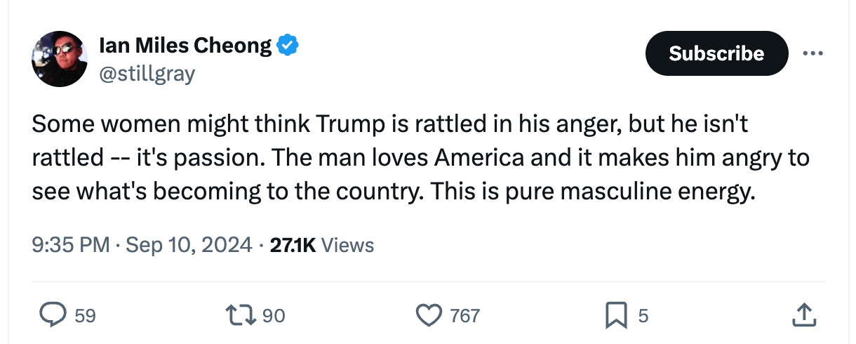 Simply put: Trump looked weird last night. And though much has already been written about the whole “Republicans are weird” messaging, it’s part of a larger culture shift that Harris and her team have correctly identified from her campaign’s launch. The internet no longer prioritizes mass appeal. What’s popular isn’t viral and what’s viral isn’t popular. And you could argue that it’s because no one watches the news anymore. Or it’s because Facebook and Instagram are broken. Or it’s that streaming platforms don’t — and can’t — reflect real interest. Or it’s because TikTok’s algorithm flipped virality on its head, laser-targeting niche user interests rather than blasting out the same 10 mega viral videos at everyone. Either way, things are different now. And it has always been, ahem, low key cringe to talk about internet stuff out loud. But now if you do it you’re completely incomprehensible. And so, for the first time in Trump’s political career, last night, he was the one that got steamrolled, not his opponent. Because there is simply nothing more embarrassing than awkwardly trying to remember something you read online to try and win an argument.
