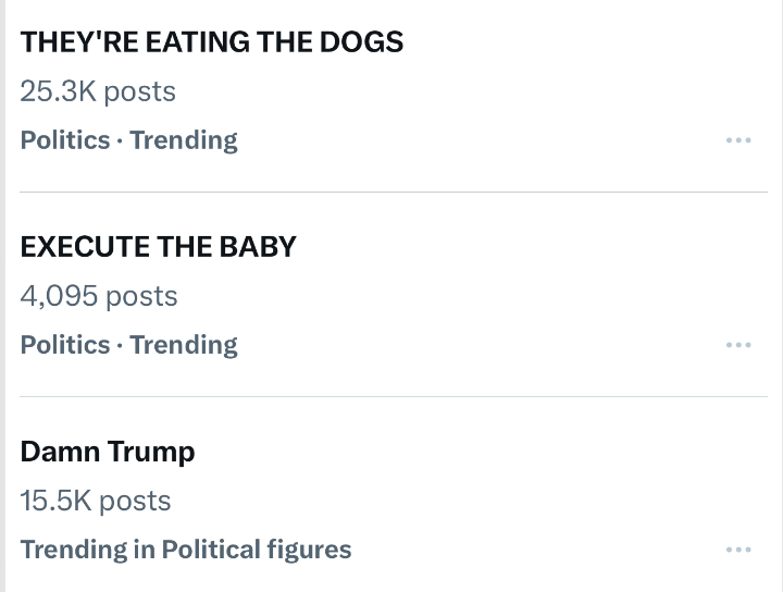 I was hesitant to give Vice President Kamala Harris too much credit for Trump’s embarrassing performance last night, but after the third or fourth time she successfully pulled off the same maneuver it was obvious she knew what she was doing and that it was working as intended. Her strategy last night was an extension, or an evolution, of her campaign’s “Republicans are weird” line, but with a bit more juice behind it. And, well, if the X Trending Topics last night are anything to go on, it worked pretty well.