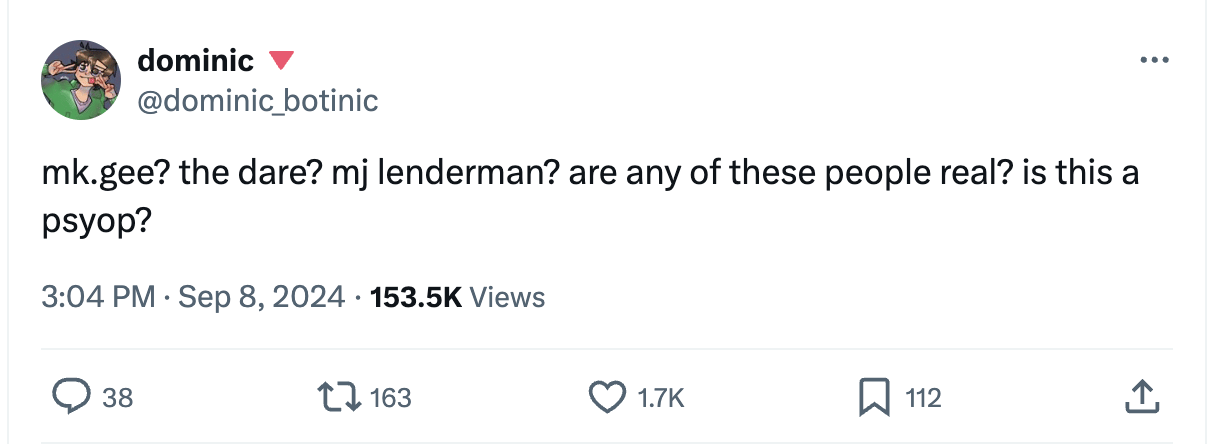 It seems like he’s finally making an earnest attempt to break through and now it is, I suppose, time to fully engage. Pitchfork just gave his new album a 6.2, which I think is a little generous. That said, I don’t hate what he’s doing. It’s basically LCD Soundsystem without the pathos, The Strokes without the edge, or MGMT without the hooks. To quote a deleted X post from user @kaylaancrum that I had earmarked to talk about this very idea, “Gen Z is always trying to recreate what it was like in 2006 (for good reason) and almost none of them succeed.”