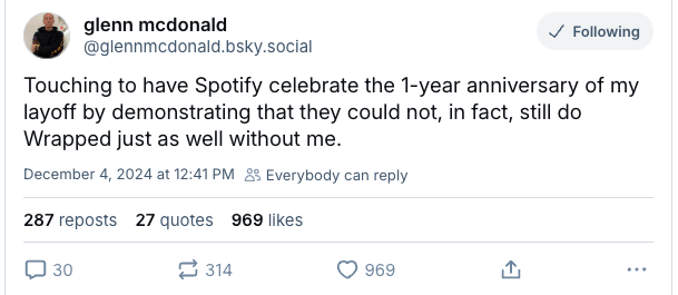 And he was appropriately snarky on Bluesky about how bad Wrapped was this year.