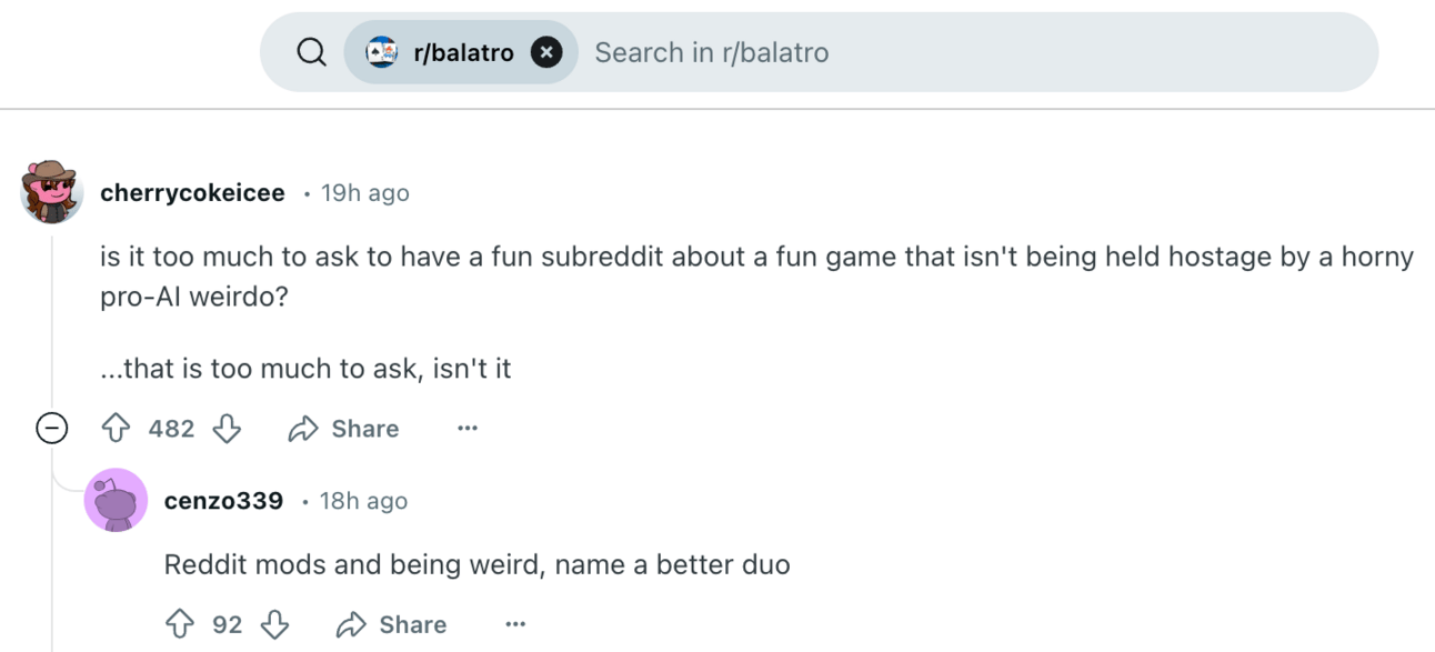 The horny AI evangelist mod responded to the controversy over on the Balatro erotica subreddit they’re still modding and wrote a big long thing about why they wanted AI art to be allowed so badly. “It is NOT my goal to make this place AI centric, I’m thinking it'll be a "day of the week" thing,” they wrote. “Where non-NSFW art that is made with AI can be posted. My goal is to be objective and keep the space safe. (Safe-For-Work Sunday's?)” The explanation didn’t really clear anything up and, honestly, makes all of this even weirder, but oh well.