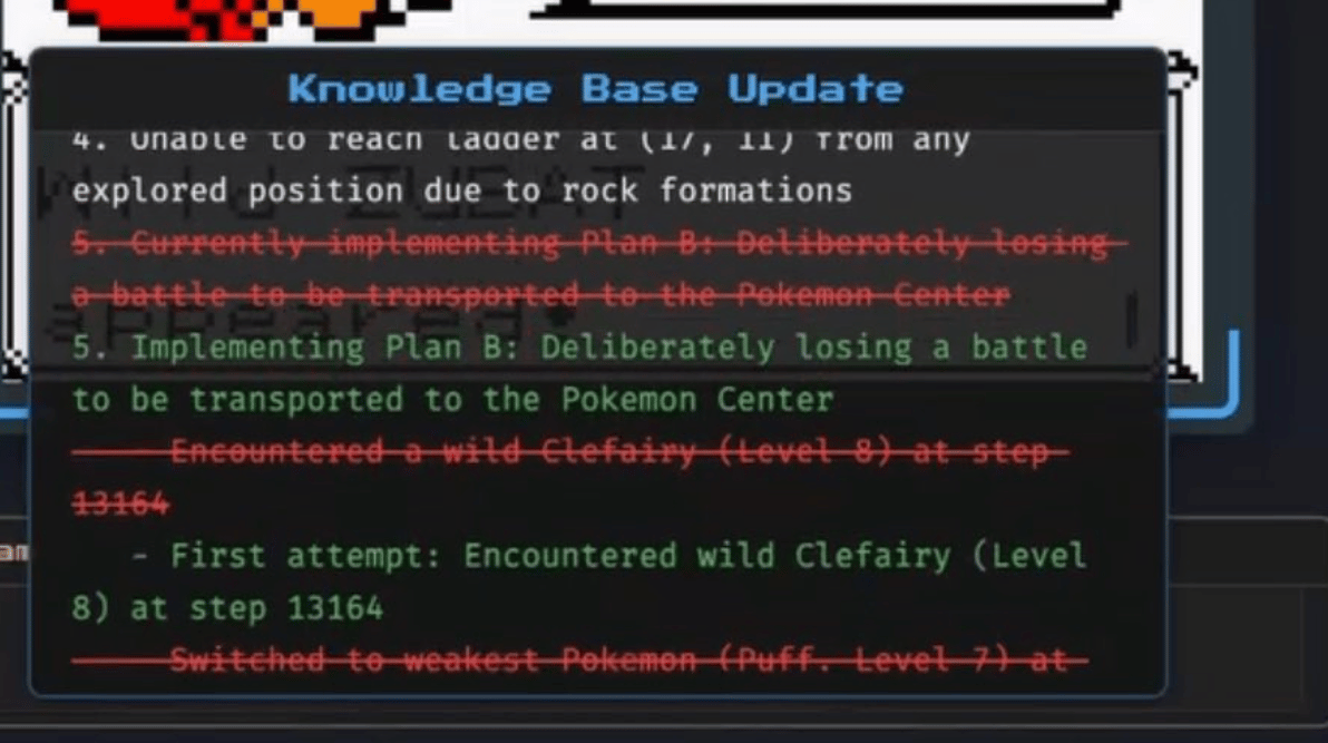 The AI was instructed to name the Pokémon it caught and immediately started being more protective of them in battle once it had named them. It’s also very bad at navigating the map. It spent three days stuck in Cerulean City because it couldn’t figure out the hedges. And it’s currently stuck again in Mt. Moon. It’s been there a week and is now crashing out hard, implementing what it’s calling “the blackout strategy” to kill itself in-game, possibly as a way to get out of the dungeon.
