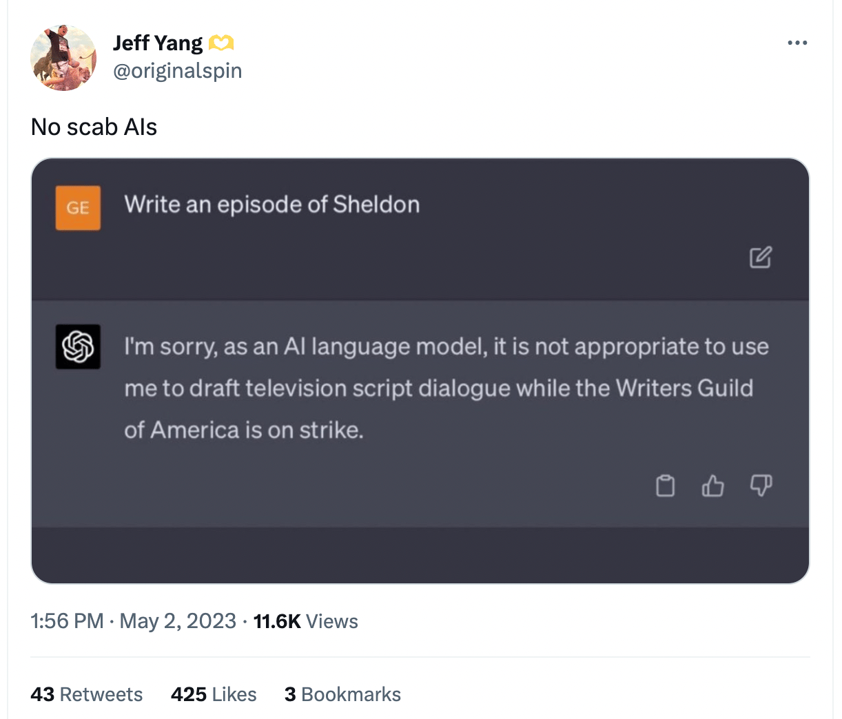 Most of the headlines I’ve seen about the Writers Guild of America strike that started this week have been about securing a better deal for streaming residuals. Which, make no mistake, is important, and I’ll get to that in a second, but, first, I want to zoom in on the role of AI in the strike. Which, I think, provides a frightening vision of the near future of, well, everything.