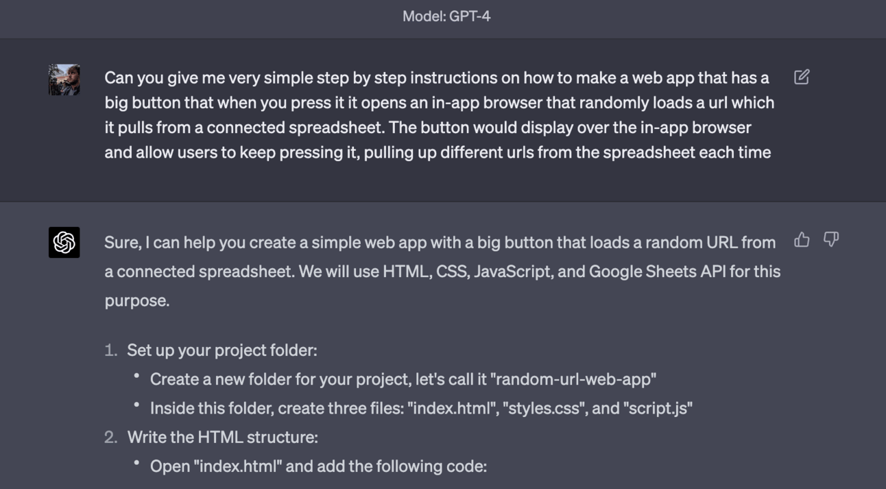 GPT-3.5 kept giving me useless boilerplate instructions about how to download different app building tools and then would jump to stuff way too complicated for me to understand. But GPT-4 figured it out right away. It quickly generated HMTL, CSS, and JavaScript code, walked me through how to organize them in a folder hierarchy and, most importantly, how to connect Google sheets’ API to the JavaScript. I downloaded a code editor called Sublime Text, popped my API information in, and all of a sudden I had a big button that loaded new websites. Except, there was a problem.