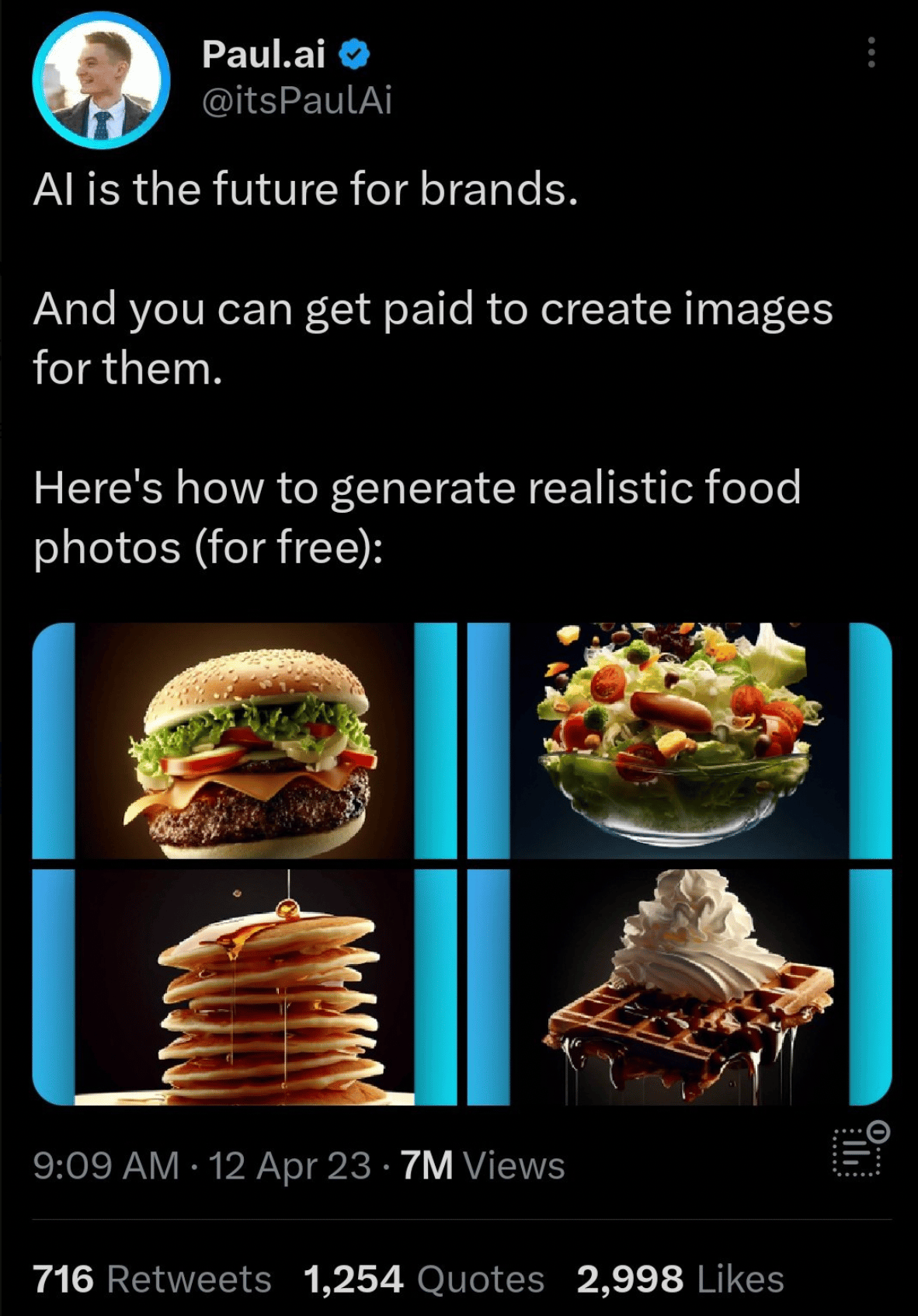An AI evangelist that goes by Paul.ai went viral (in the bad way) over the weekend after he posted a big thread about how you can generate “realistic food photos” with AI. The thread was a mess and he ended up deleting it. Everything he was suggesting in it is, thankfully, very illegal.