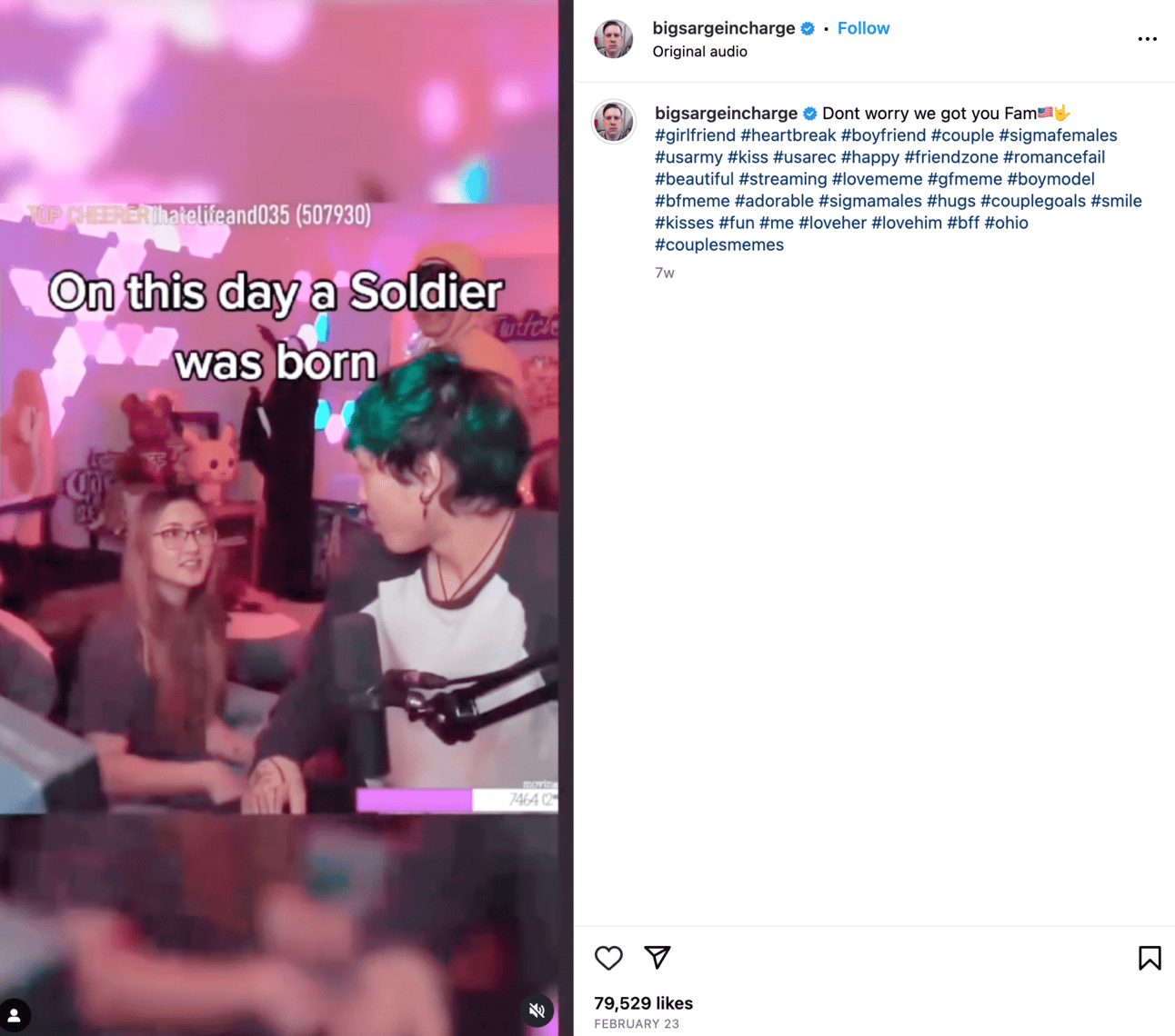 If you’ve never seen the original clip, it’s from a streamer named Mews. During a stream he got “friendzoned”. It went viral. I don’t know if it’s real or staged, but I assume it was staged. Not the point. Cradlebaugh edited the clip. He put the words “On this day a soldier was born” and then added a shot at the end of him welcoming a prospective soldier into the recruitment office. You can watch the clip on Instagram here. Oh, also, Cradlebaugh did a whole series of “On this day a soldier was born,” featuring random clips he found of men be supposedly rejected by women. Very cool.