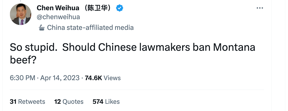 It was also an aggressive enough move that China’s wolf warrior Twitter accounts are publicly grumbling about it, with Chen Weihua, a columnist for China Daily, suggesting China ban Montana beef.