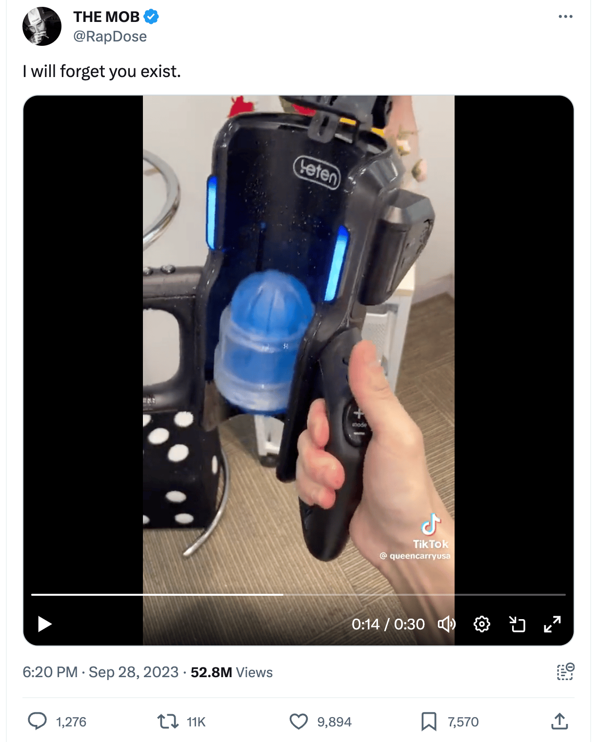 It was shared by a rap producer named Kenny Bear. He’s verified and it’s a video, so I assume that helped push it around the app. He does not appear to actively shilling fleshlights, though. OK, but what about the original video?