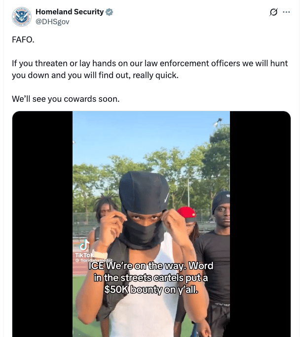 The Department of Homeland Security is beefing with a TikToker right now, a sentence that would have seemed unthinkable nine months ago. Last week, DHS posted a video on X, threatening to “hunt down” TikTok users that “lay hands on” Immigration and Customs Enforcement officers. The video in the post had a caption that read, “ICE we’re on the way. Word in the streets cartels put a $50k bounty on y’all.”