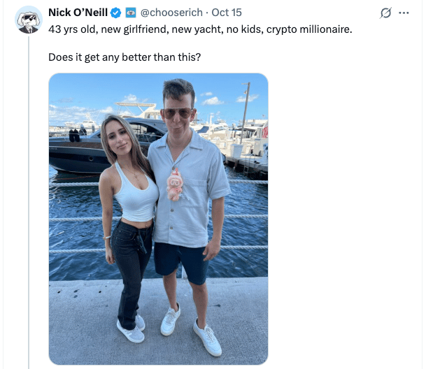 Miami-based crypto trader Nick O’Neil has a history of bragging about how rich he is online and then swiftly getting called out. Last time he did it was last year, when he posted a photo of a boat he was on that he claimed was a yacht (it wasn’t). This time he posted a photo with a woman he implied was his girlfriend (it wasn’t).