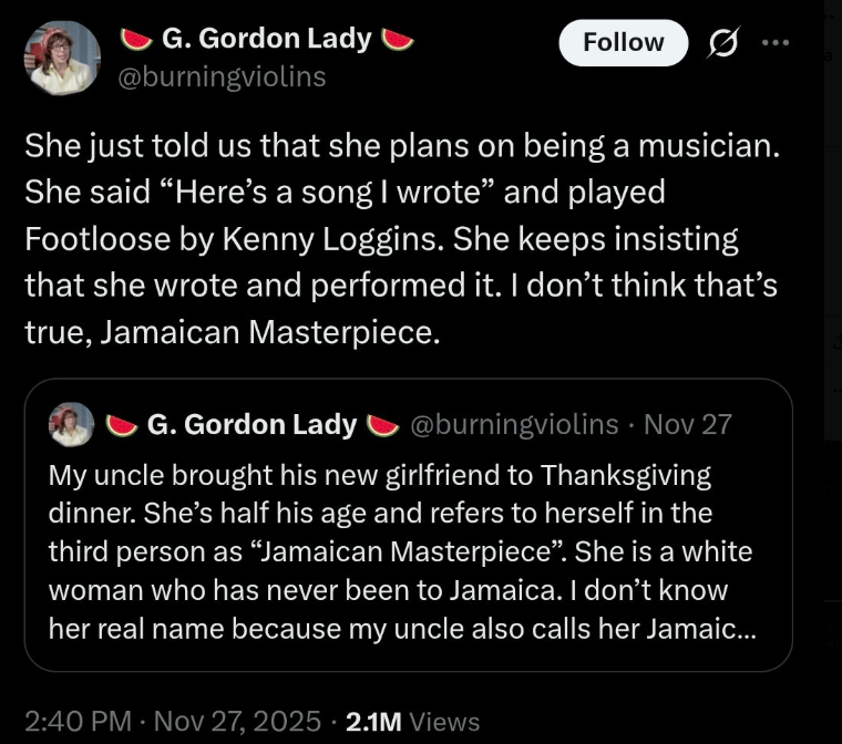 Boy, was that prescient! Because this weekend, X users went wild for a thread they’re now calling the “Jamaican Masterpiece thread,” posted by user @burningviolins. The user has since deleted their account, but here’s a screenshot that should give you the gist of what it was about.